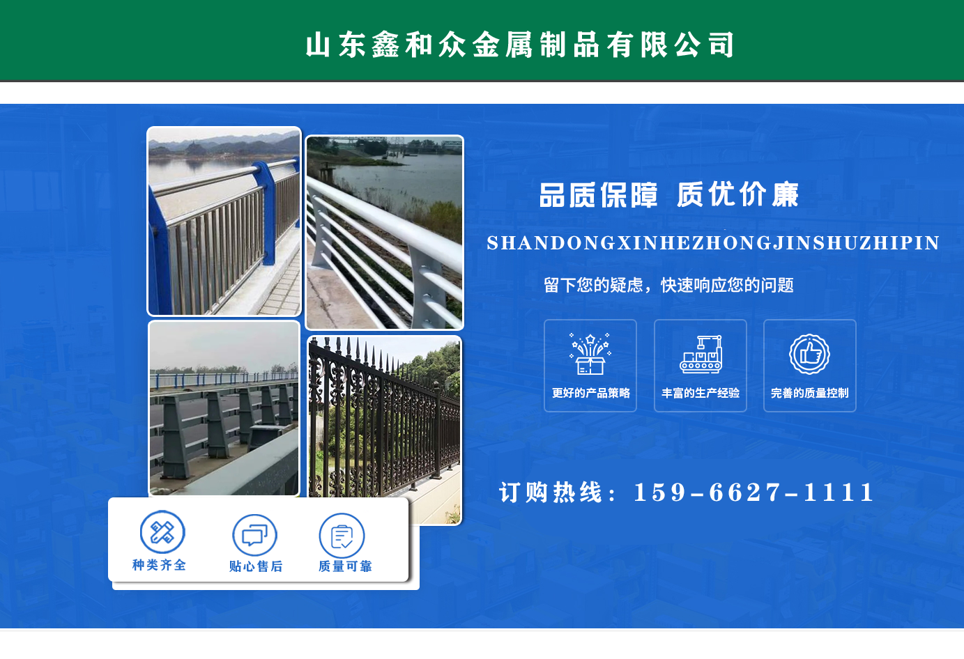 山東鑫和眾金屬制品有限公司主要產(chǎn)品有防撞護(hù)欄,橋梁護(hù)欄,道路護(hù)欄,河道護(hù)欄,不銹鋼護(hù)欄等護(hù)欄。提供設(shè)計(jì)方案,一站式定制,包您滿意價(jià)格優(yōu)惠,歡迎來電咨詢! 公司常年從事銷售護(hù)欄防撞護(hù)欄,橋梁護(hù)欄,道路護(hù)欄,河道護(hù)欄,不銹鋼護(hù)欄,橋梁鋼護(hù)欄,河道燈光護(hù)欄等。產(chǎn)品廣泛應(yīng)用于橋梁、河道、旅游景區(qū)、道路、公路、公園、小區(qū)、景觀、道路防撞等領(lǐng)域。 公司產(chǎn)品均采用優(yōu)質(zhì)不銹鋼材料,符合相關(guān)標(biāo)準(zhǔn)。各種型號(hào)不銹鋼復(fù)合管及護(hù)欄,質(zhì)量嚴(yán)格把控。產(chǎn)品強(qiáng)度高、耐腐蝕、焊接牢固、抗沖擊、性能好,防撞護(hù)欄結(jié)構(gòu)簡(jiǎn)單、美觀實(shí)用大方?! g迎前來訂購!...